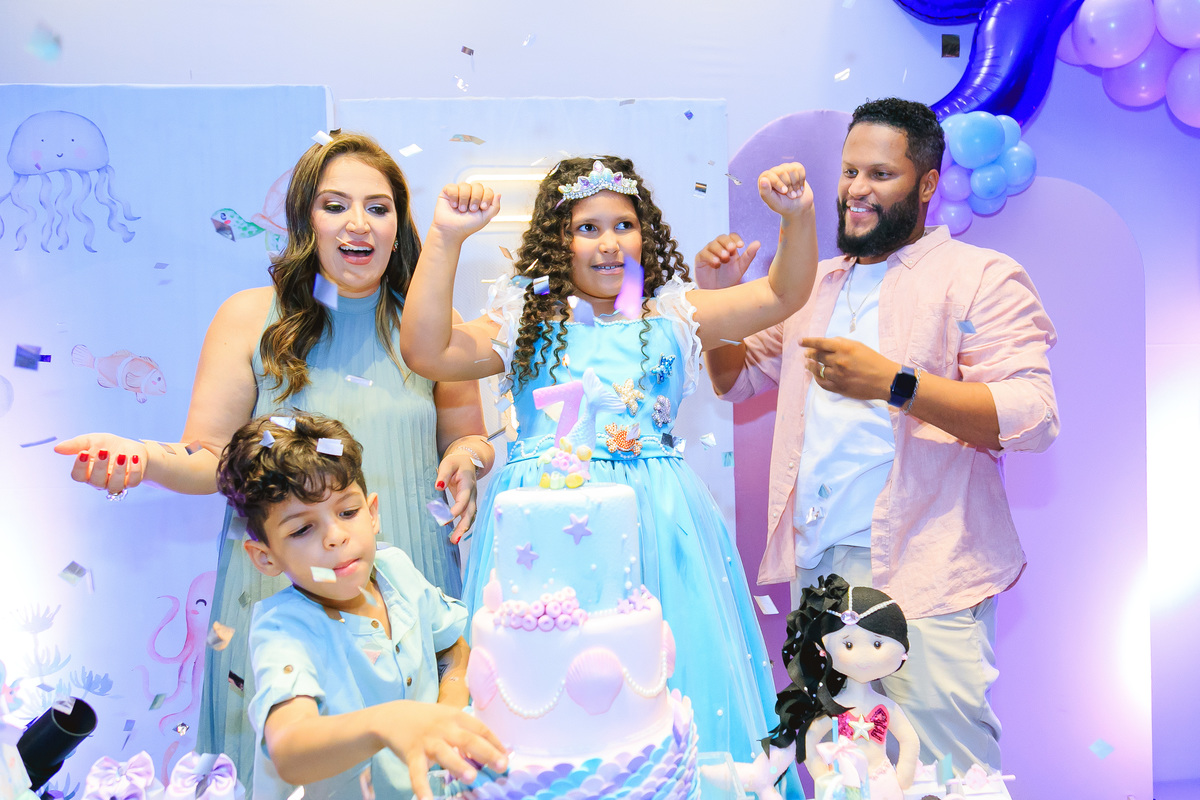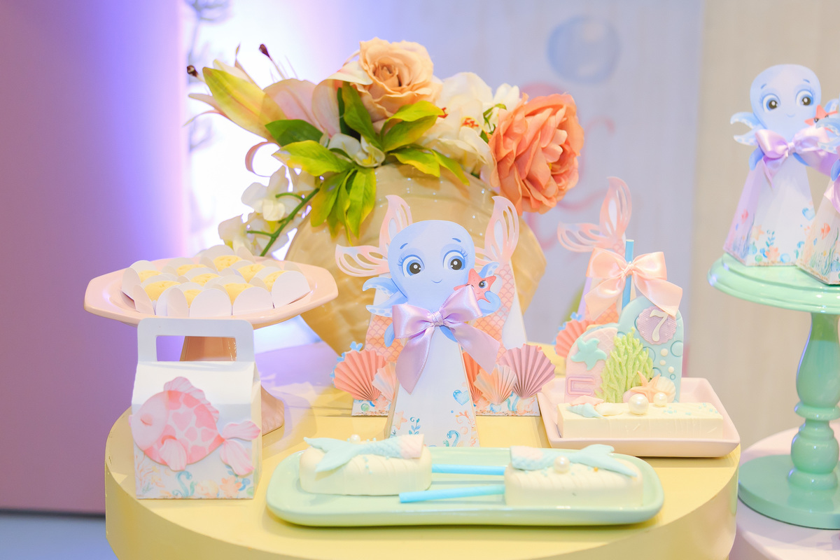 A Festa da Catarina, com o tema "Pequena Sereia", foi um verdadeiro mergulho no mundo encantado do fundo do mar! A decoração estava deslumbrante, com cores vibrantes e elementos que transportaram os convidados para o universo mágico de Ariel e seus amigos marinhos. Conchas, estrelas do mar, corais e muito brilho realizado um ambiente de conto de fadas que encantou a todos. As músicas temáticas, os jogos e as atividades interativas mantiveram a animação durante toda a festa. A alegria e a magia do oceano foram vividas em cada detalhe, tornando a festa de Catarina uma experiência inesquecível
